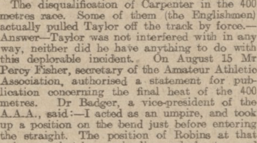 Both contemporaries and historians place emphasis on an American-British controversy in which Americans accused British referees of favoritism, especially in the light of the disqualification of an American athlete in the 400m dash.4
